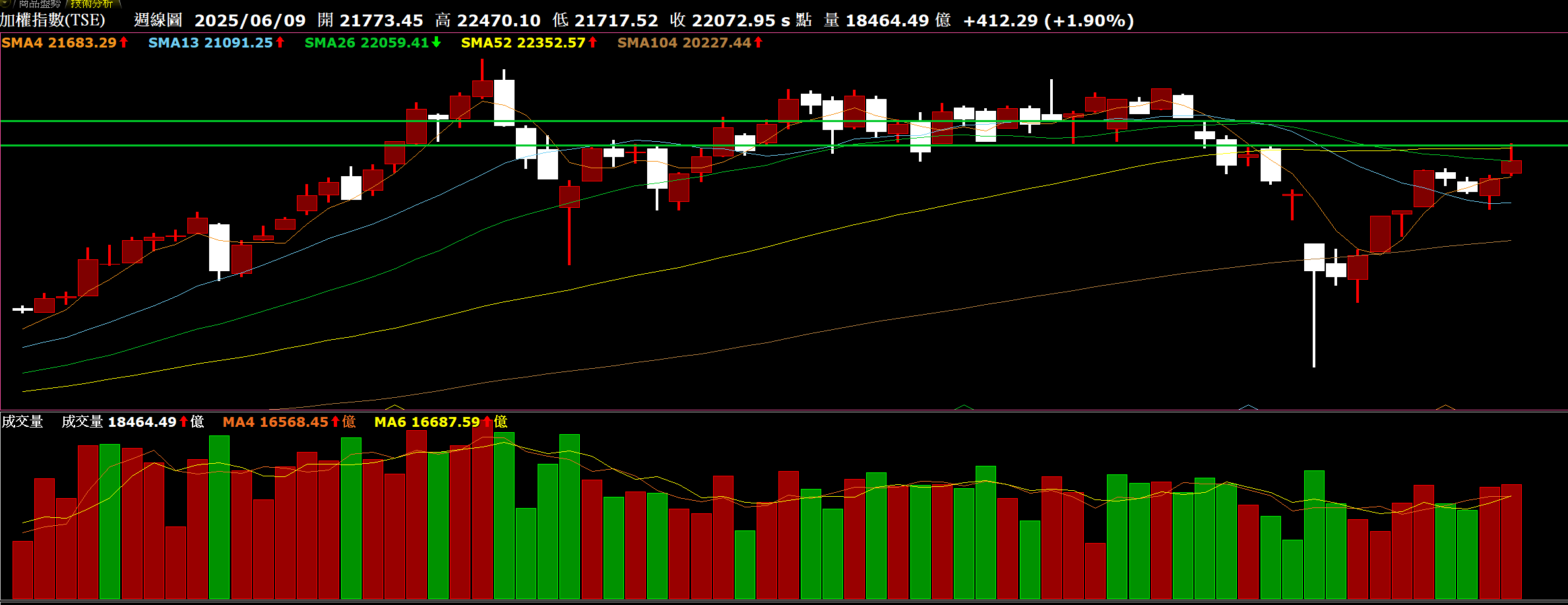 加權指數本週高點逼近22,000點大關,但整體呈現高檔震盪走勢,終場收在約21,600點附近,全週小跌約0.88%。儘管盤中曾有攻勢,但面對上方年線與前高壓力,市場多空拉鋸明顯。