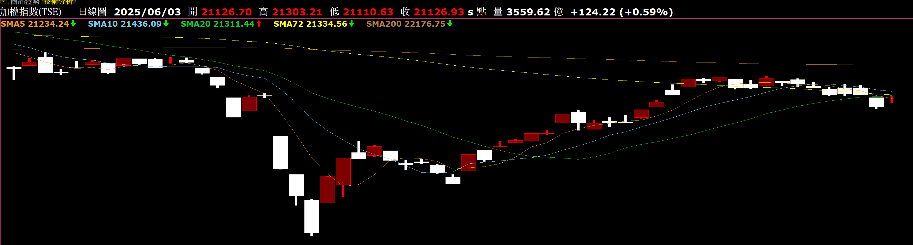 台股日K線已連續七根黑K,顯示市場短期內多頭力道不足。每當指數跳空開高,便引發獲利了結的賣壓,導致指數回落。此外,指數跌破5日、10日、20日均線,短期趨勢轉弱,投資人信心受挫。