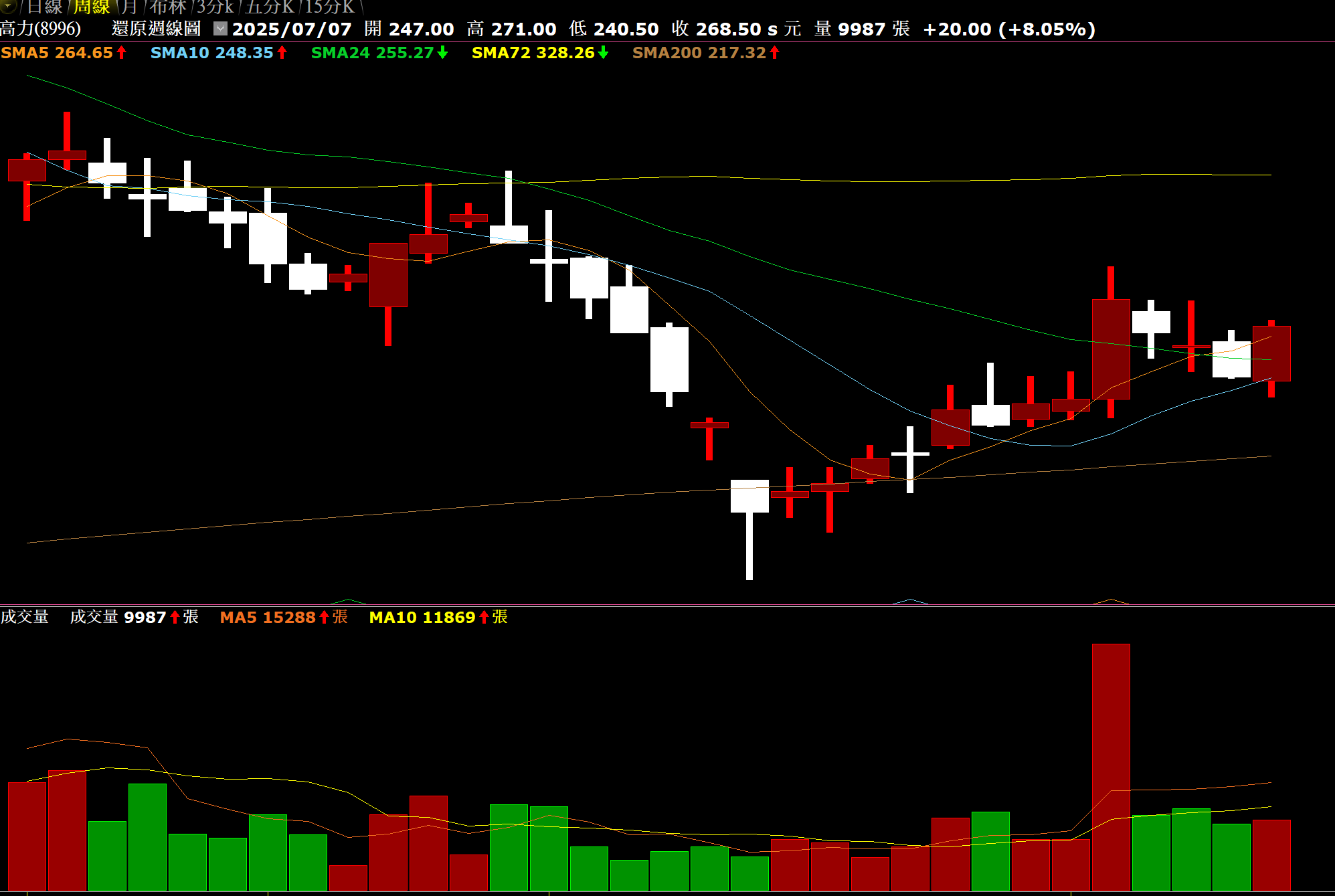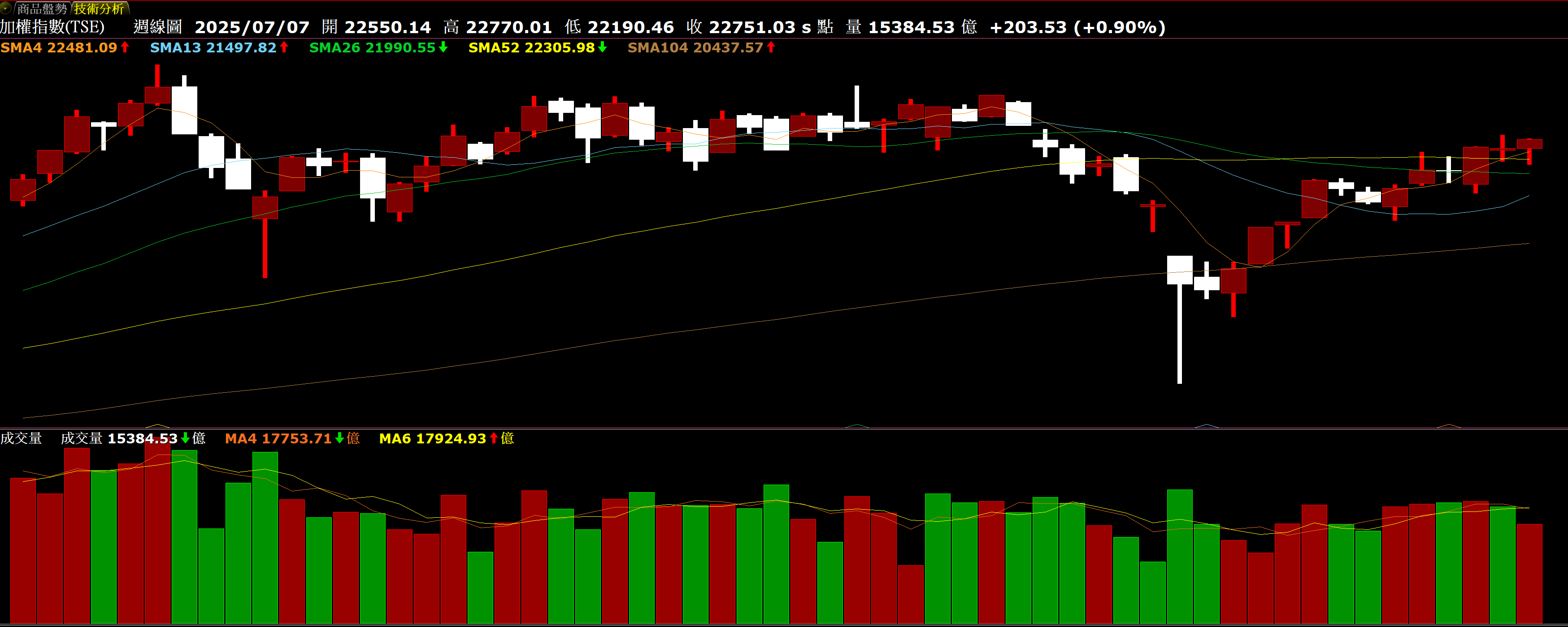 周線級別在6/9那一周有爆大量上漲,而後的幾周都是量縮整理,但我覺得這就是一個表態後的回檔整理,整體趨勢尚未完全噴發,因此後續會比較注意日線級別狀況
