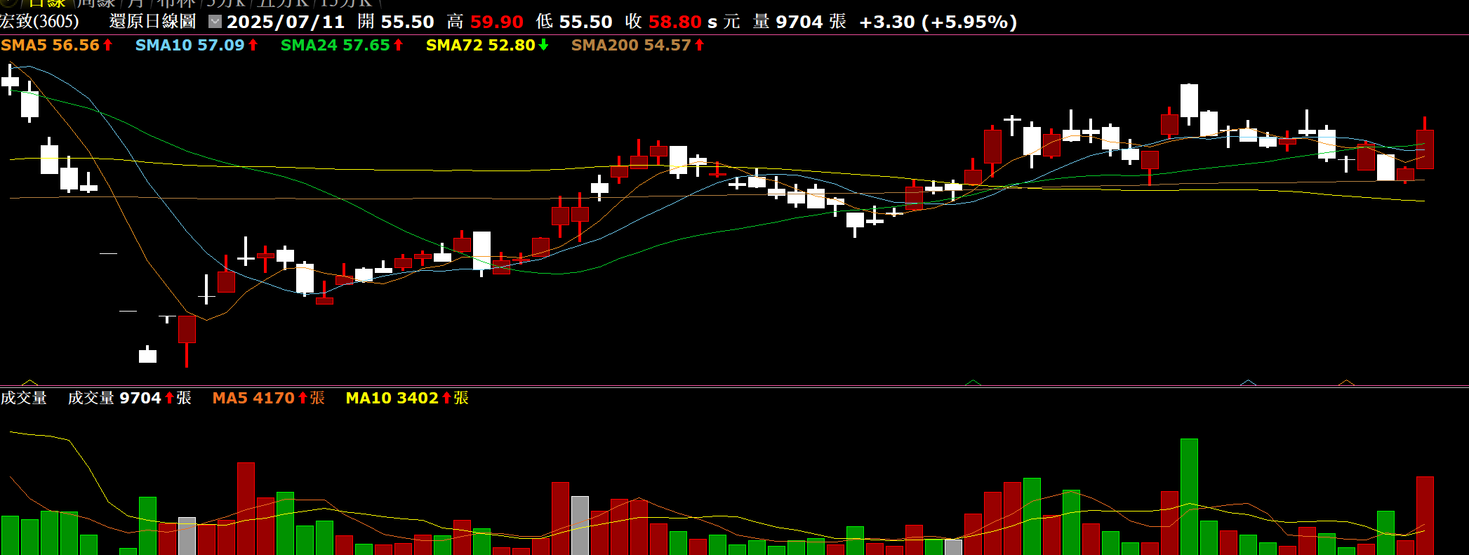 注意到日線級別,周五的時候轉強向上,價漲量增,切到周線級別也可以注意到是一個回測5.10.24均線的狀況