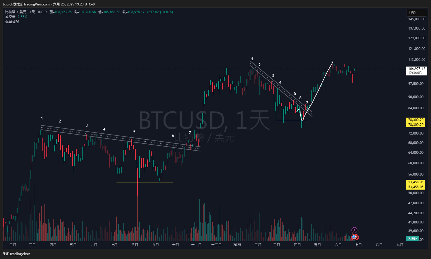 2 月底預估 TP 75800 已精準達標,預判破底情境已發生 4/9 即時提醒型態達標後兩次踩底,形成 W 底 目前觀察是否發展第三點,有潛在楔形出現 補充創新高後第 7 點突破規律,目前正處第 7 點階段 預期將進入強烈多頭行情(狂!暴!大!牛!)