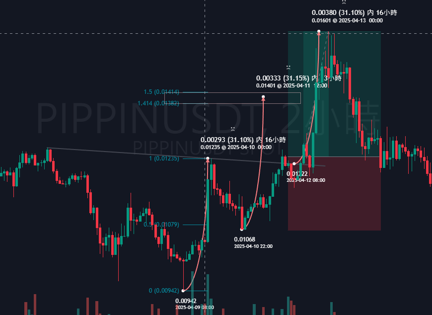 杯柄型態低點拉漲幅至頸線,再從頸線突破點再往上延伸31.1%,會來到0.016。
